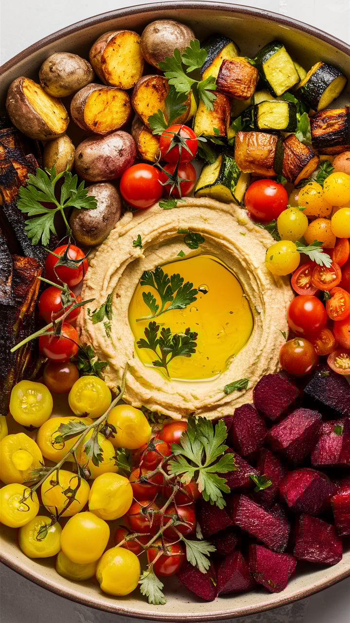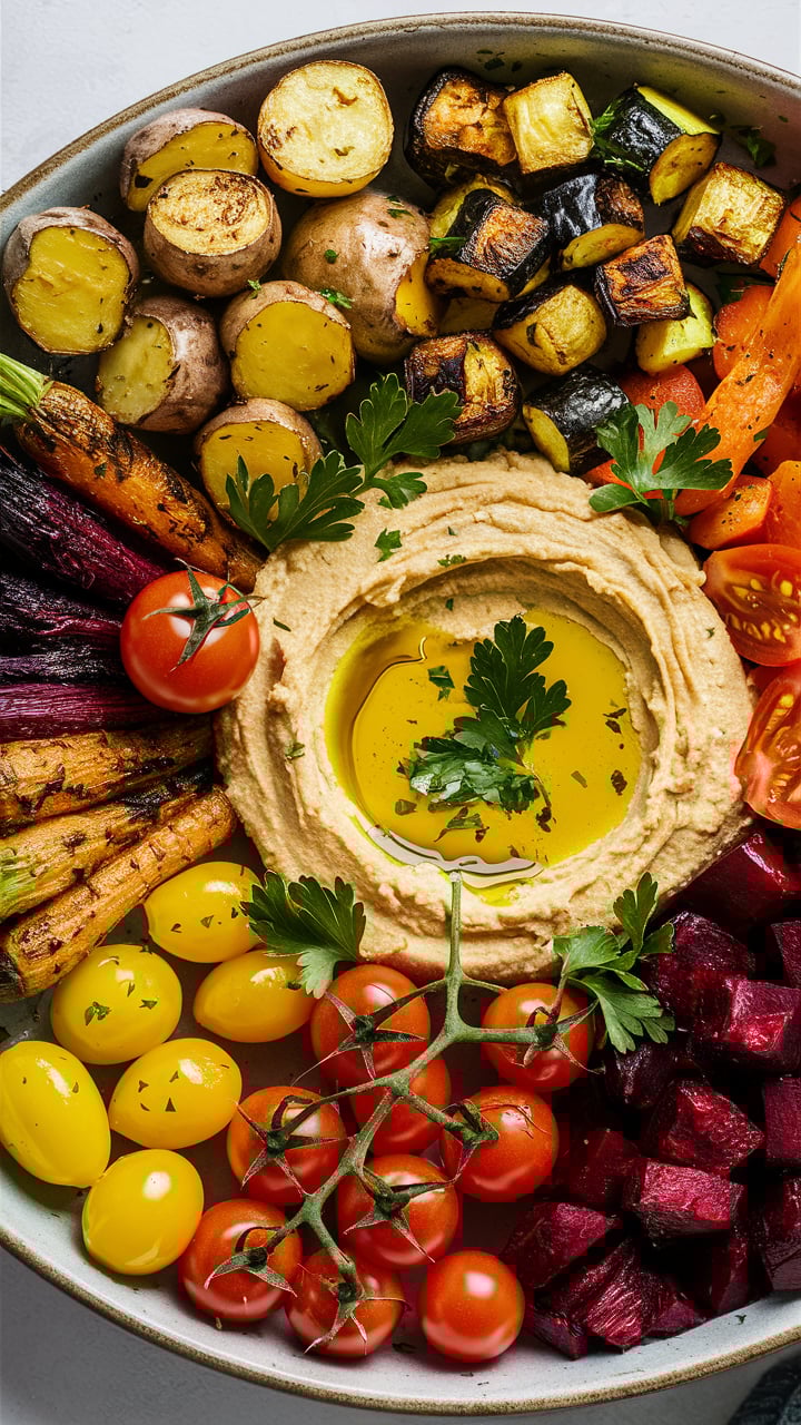 - A rainbow of roasted vegetables paired with creamy hummus is visually stunning.