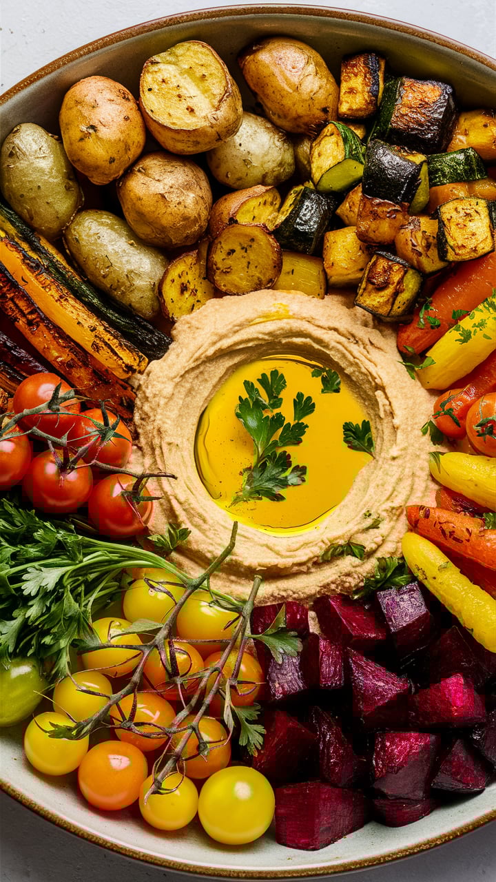 - As a Party Platter: Spread hummus on a large plate, arrange roasted veggies around, and serve as a mezze-style appetizer.